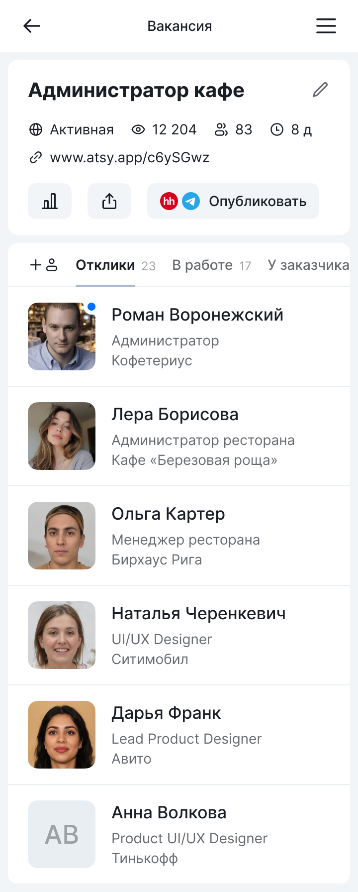 Отклики из Telegram-каналов, с лендинга вакансии, hh.ru и из других источников собираются в одном удобном интерфейсе