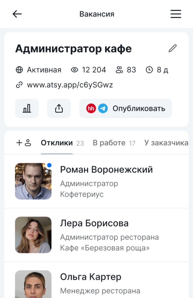 Atsy позволяет разместить вакансию менеджера по продажам в релевантных Telegram-каналах за 2 минуты. Сервис сам составит описание должности и требования к опыту, создаст лендинг с формой отклика и соберёт все заявки в удобном интерфейсе. Вам остаётся только выбирать лучших.